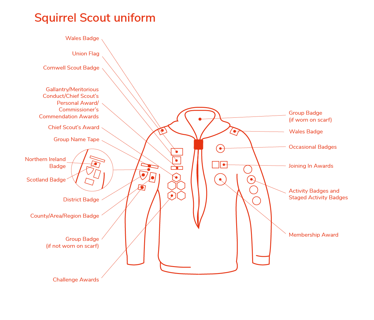 Squirrels uniform consists of a red sweatshirt with your badges sewn on and a coloured scarf or ‘necker’ to represent your local group. There are lots of other optional accessories you can wear such as hats, hoodies, navy blue trousers or shorts, if you’d like to.